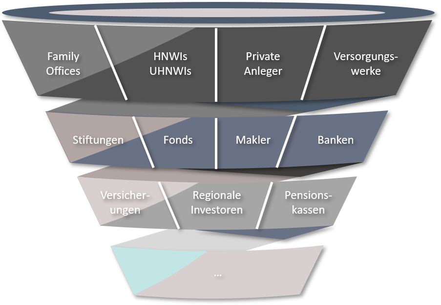 4RE is in regular contact with numerous private investors, semi-professional and institutional investors, foundations and banks. Particularly remarkable is the first-class contact with family offices and wealthy private clients who regularly appear on the market.